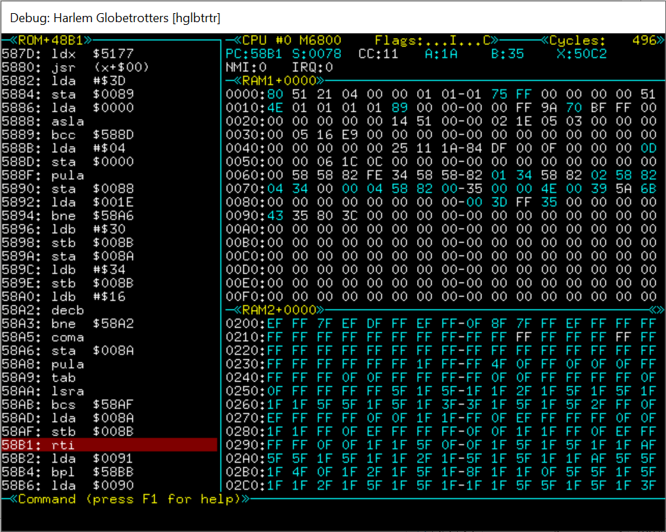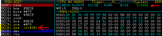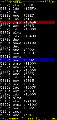 LDX #$2B1 ziet er goed uit. Als we de BSR van $5f4a eens vervangen door twee nops? Dat kun je doen door in debug “D 1 5F4A[return]” te typen en dan met [TAB] naar het voormalige RAM1 scherm te gaan en “01 01” te typen. Ga nu weer terug naar GO mode en kijk of het gewerkt heeft.