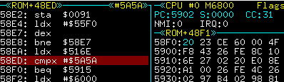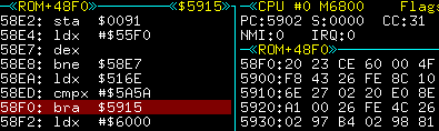Een stukje voor de lus zien we een check of adres $516E de waarde $5A5A heeft. Indien dat waar is springt het over de loop heen. We kunnen de BEQ vervangen door een BRA, of 5A5A in dat adres zetten. Omdat het buiten onze rom valt vervangen we de BEQ(27) door BRA(20) op adres 58F0.