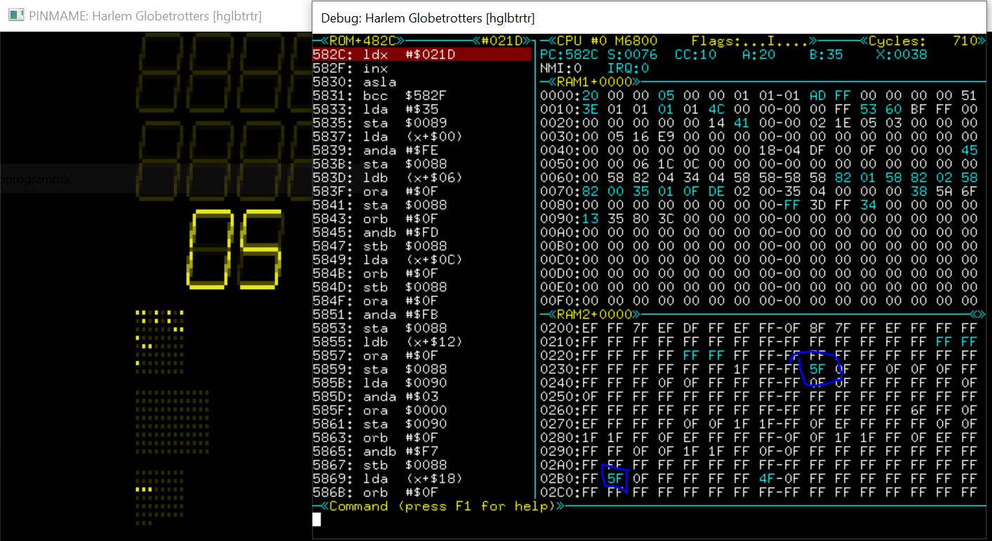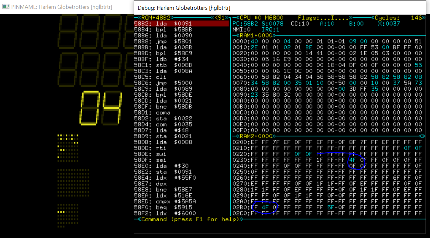 Als test gebruiken we de harlem globetrotters roms. Standaard staan de dipswitches in vpinmame zo dat de credits niet te zien zijn. De handleiding geeft aan dat dipswitch 27 aan moet staan om de credits te tonen. Als vpinmame met debugger op de voorgrond staat kun je met “G [return]” naar GO mode en vanuit GO mode met ‘`’ (backtick onder escape) naar de debugger. Kijk uit voor de escape key, daarmee verlaat je vpinmame.