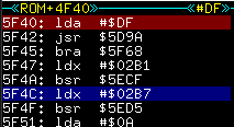 STA (X+$5) lijkt niet op iets met 0x2b1. Maar aangezien X hier 0x2AC is en er +$5 staat klopt het wel. Toch is dit niet de plek voor de aanpassing. Dit lijkt te globaal. We moeten dus gaan kijken waar deze functie aangeroepen is. met [F8] volgen we de DEX en de RTS. Ga nu weer met pijltjes omhoog tot de listing verspringt tot leesbare code.