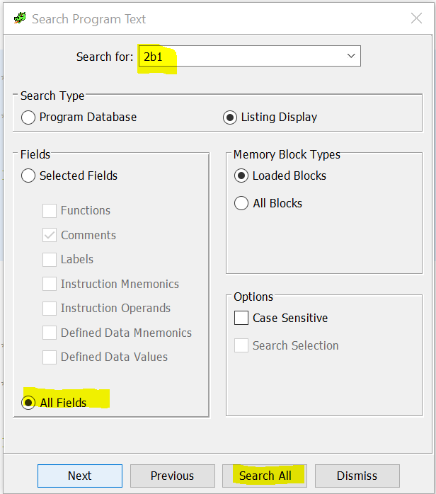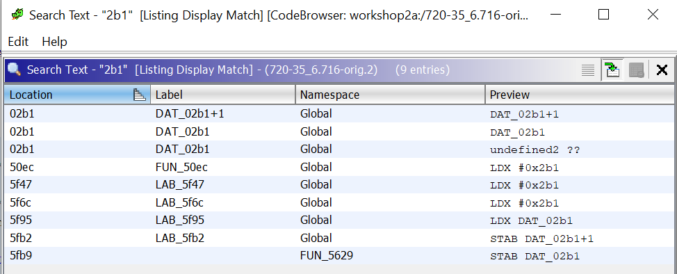 In de vorige workshop hebben we gezien dat de credits op geheugenadres 2b1 staan. Ga naar search→program text en zoek alle verwijzingen naar 2b1 in de listing.